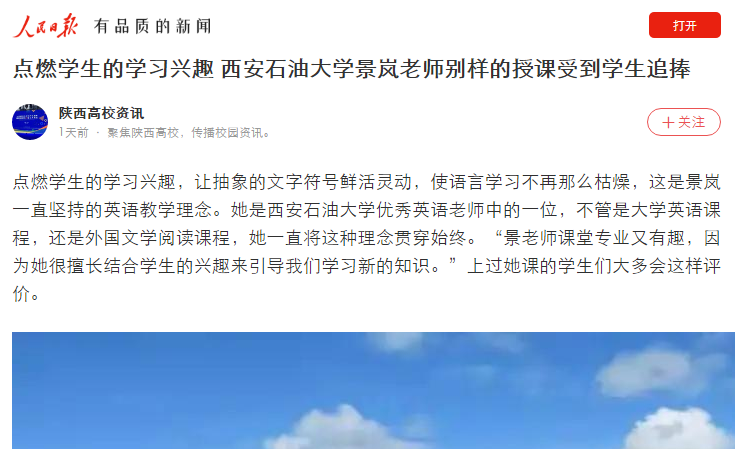 景嵐的努力學(xué)生們看在眼里記在心里。學(xué)生們常常會(huì)被她認(rèn)真的準(zhǔn)備和精彩的講解而感動(dòng)。她的學(xué)生邱冬說:“景老師會(huì)耐心帶領(lǐng)我們學(xué)習(xí)課文的背景知識(shí),拓寬我們的知識(shí)面。我知道,這一定需要她花費(fèi)很多時(shí)間和精力備課。我要為景老師的認(rèn)真負(fù)責(zé)點(diǎn)贊!”