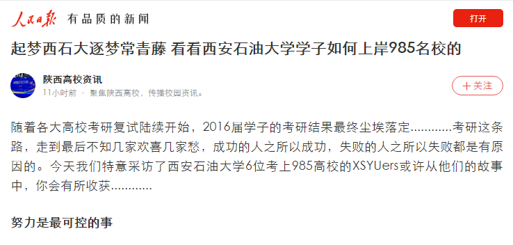 經(jīng)驗(yàn)總結(jié):這次難忘的復(fù)試經(jīng)歷讓我收獲了很多,也反思了很多。在我看來,能夠支撐我走到最后的優(yōu)勢(shì)是相比常人更為豐富的實(shí)踐經(jīng)驗(yàn):大一到大三這幾年,在黨委宣傳部新媒體中心為官微撰寫推文的經(jīng)歷讓我熟練掌握了新媒體公眾號(hào)的運(yùn)營(yíng)技能。得益于官微的平臺(tái)之大,我還有幸參加了陜西省省級(jí)的新媒體沙龍交流會(huì),進(jìn)一步學(xué)習(xí)到了高校自媒體的運(yùn)營(yíng)策略,這也直接助推了我的b站影視頻道“-Funtime-”的誕生,讓我對(duì)媒體的運(yùn)營(yíng)有了更加深切的體驗(yàn)。另外,大三下半學(xué)期我開始了在“騰訊大秦網(wǎng)”為期兩個(gè)月的實(shí)習(xí),為“吃貨在西安”、“西安種草機(jī)”撰寫美食、旅游類稿件。這所有的經(jīng)歷都讓我對(duì)新聞學(xué)的實(shí)踐更加得心應(yīng)手,同時(shí)也產(chǎn)生了更加深度的熱愛。