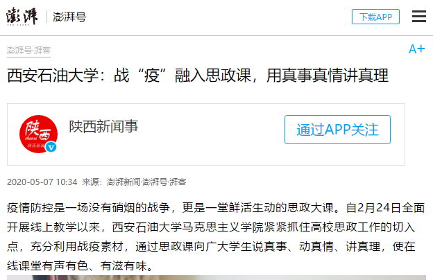 疫情防控是一場沒有硝煙的戰(zhàn)爭,更是一堂鮮活生動的思政大課。自2月24日全面開展線上教學以來,西安石油大學馬克思主義學院緊緊抓住高校思政工作的切入點,充分利用戰(zhàn)疫素材,通過思政課向廣大學生說真事、動真情、講真理,使在線課堂有聲有色、有滋有味。