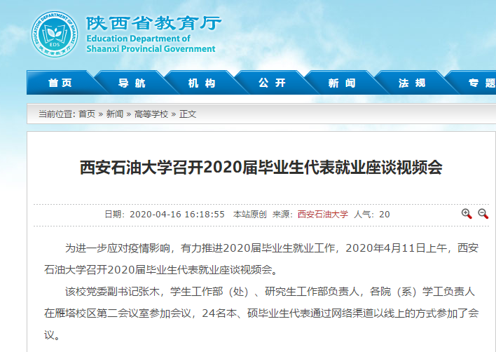 為進(jìn)一步應(yīng)對疫情影響,有力推進(jìn)2020屆畢業(yè)生就業(yè)工作,2020年4月11日上午,西安石油大學(xué)召開2020屆畢業(yè)生代表就業(yè)座談視頻會(huì)。
