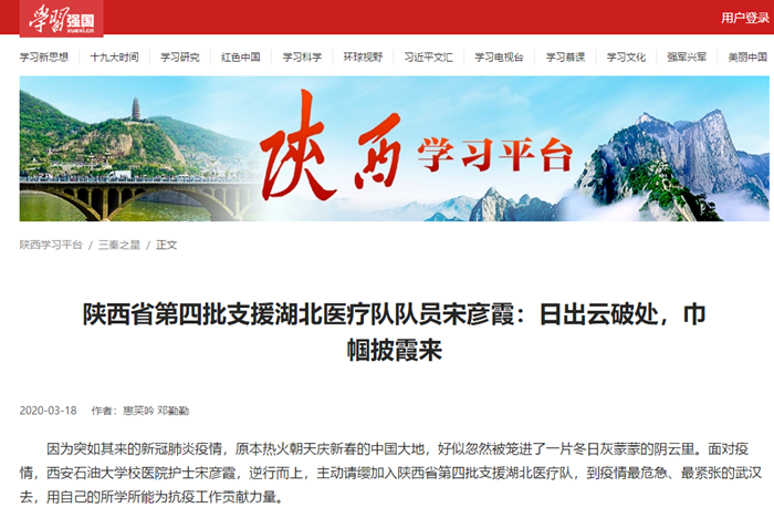 因?yàn)橥蝗缙鋪?lái)的新冠肺炎疫情,原本熱火朝天慶新春的中國(guó)大地,好似忽然被攏進(jìn)了一片冬日灰蒙蒙的陰云里。面對(duì)疫情,西安石油大學(xué)校醫(yī)院的宋彥霞護(hù)士,逆行而上主動(dòng)請(qǐng)纓加入陜西省第四批援鄂醫(yī)療隊(duì),到疫情最危急、最緊張的武漢去,用自己的所學(xué)所能為抗疫工作貢獻(xiàn)力量。