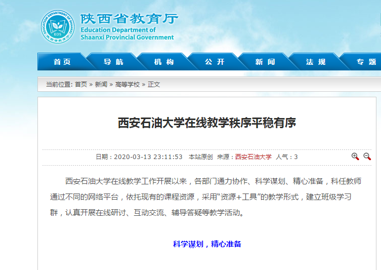 ——方案先行。學(xué)校出臺(tái)《西安石油大學(xué)疫情防控期間本科教學(xué)工作方案》《西安石油大學(xué)疫情防控期間本科在線教學(xué)工作方案》《西安石油大學(xué)疫情防控期間本科在線教學(xué)工作預(yù)案》等,從組織領(lǐng)導(dǎo)、教學(xué)準(zhǔn)備、教學(xué)實(shí)施、質(zhì)量保障等方面提出要求,全力保障疫情防控期間本科生教學(xué)工作的有序開(kāi)展和線上教學(xué)質(zhì)量的持續(xù)改進(jìn)。