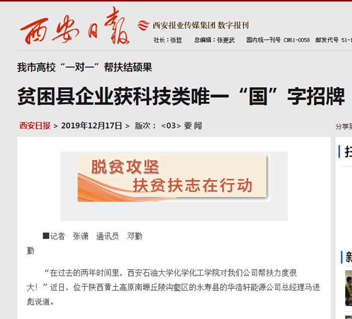 “在過(guò)去的兩年時(shí)間里,西安石油大學(xué)化學(xué)化工學(xué)院對(duì)我們公司幫扶力度很大!”近日,位于陜西黃土高原南塬丘陵溝壑區(qū)的永壽縣的華浩軒能源公司總經(jīng)理馬進(jìn)彪說(shuō)道。