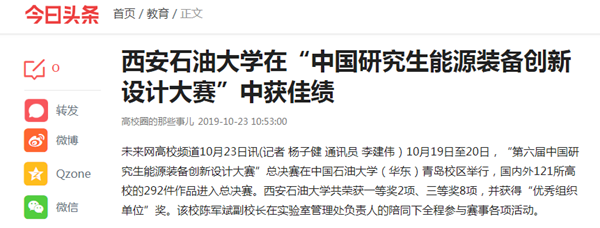 未來網(wǎng)高校頻道10月23日訊(記者 楊子健 通訊員 李建偉)10月19日至20日,“第六屆中國研究生能源裝備創(chuàng)新設計大賽”總決賽在中國石油大學(華東)青島校區(qū)舉行,國內(nèi)外121所高校的292件作品進入總決賽。西安石油大學共榮獲一等獎2項、三等獎8項,并獲得“優(yōu)秀組織單位”獎。該校陳軍斌副校長在實驗室管理處負責人的陪同下全程參與賽事各項活動。