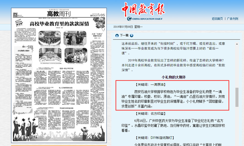 7月8日,《中國教育報》高教周刊的文章《高校畢業(yè)教育里的款款深情》,對我校的畢業(yè)禮物“一滴油”印章進行了報道。文章寫到,西安石油大學(xué)根據(jù)學(xué)校特色為畢業(yè)生準(zhǔn)備的畢業(yè)禮物是“一滴油”專屬印章。?;?、校訓(xùn)、原油,“一滴油”凸顯石油大學(xué)情懷,刻有畢業(yè)生姓名的印章彰顯對畢業(yè)生的深情厚誼,小小禮物賦予“團結(jié)勤奮,求是創(chuàng)新”豐富內(nèi)涵。
