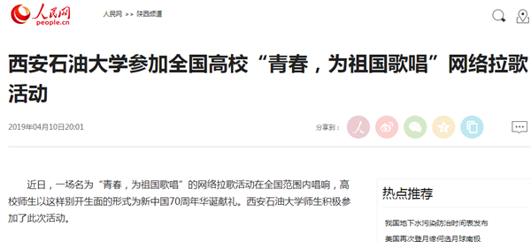 近日,一場名為“青春,為祖國歌唱”的網(wǎng)絡(luò)拉歌活動在全國范圍內(nèi)唱響,高校師生以這樣別開生面的形式為新中國70周年華誕獻(xiàn)禮。西安石油大學(xué)師生積極參加了此次活動。