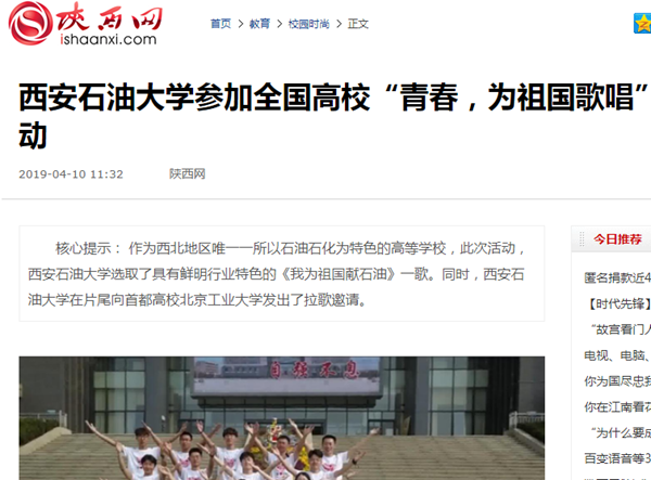 4月8日,西安交通大學(xué)在網(wǎng)絡(luò)上向西安石油大學(xué)發(fā)出拉歌邀請(qǐng)。作為西北地區(qū)唯一一所以石油石化為特色的高等學(xué)校,西安石油大學(xué)選取了具有鮮明行業(yè)特色的《我為祖國(guó)獻(xiàn)石油》一歌。在音樂(lè)系、校團(tuán)委等單位的支持下,黨委宣傳部工作人員加班加點(diǎn),完成了三校區(qū)拍攝、錄音、剪輯等一系列工作,將微視頻制作出來(lái)。西安石油大學(xué)在片尾向首都高校北京工業(yè)大學(xué)發(fā)出了拉歌邀請(qǐng)。