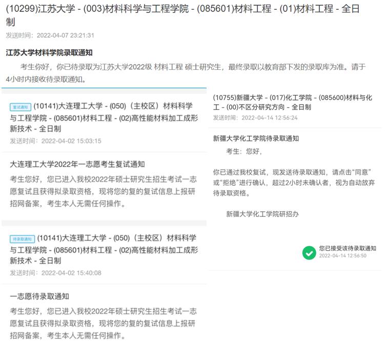 披星戴月走過的路終會以繁花以答。終于在四月初,王園媛成功調(diào)劑到江蘇大學(xué),楊思琦成功調(diào)劑到新疆大學(xué)。至此,535終于全員上岸。雖然一路艱險,一路波折,但是最終的結(jié)果沒有辜負她們的努力。