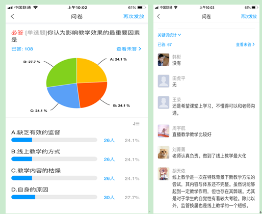 授課中郭艷英老師隨時(shí)關(guān)注學(xué)生。根據(jù)兩周線上教學(xué)的在線調(diào)查,郭老師依據(jù)學(xué)生的反饋及時(shí)調(diào)整自己的教學(xué)方法。如51%的學(xué)生認(rèn)為影響教學(xué)效果的重要因素為缺乏有效監(jiān)督和自身原因時(shí),郭老師采用了隨機(jī)抽查的方式加大督查力度,針對(duì)自律性特別差的同學(xué),采用打電話、發(fā)QQ等方式提醒督促,保證不讓一個(gè)學(xué)生掉隊(duì)。